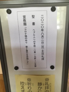 礼拝準備が整いました 2020 8/01 主日礼拝 2020年8月1日 明日の礼拝準備が整いました。 8月に入りやっと暑くなりました。でも梅雨は明けていないようだ。 コロナ対策(三密)回避と熱中症対策をしっかりして歩みたいと願っています。これから、ライフネットいかっこのスタッフ会が始まります。 主日礼拝 よかったらシェアしてね! URLをコピーしました! URLをコピーしました!