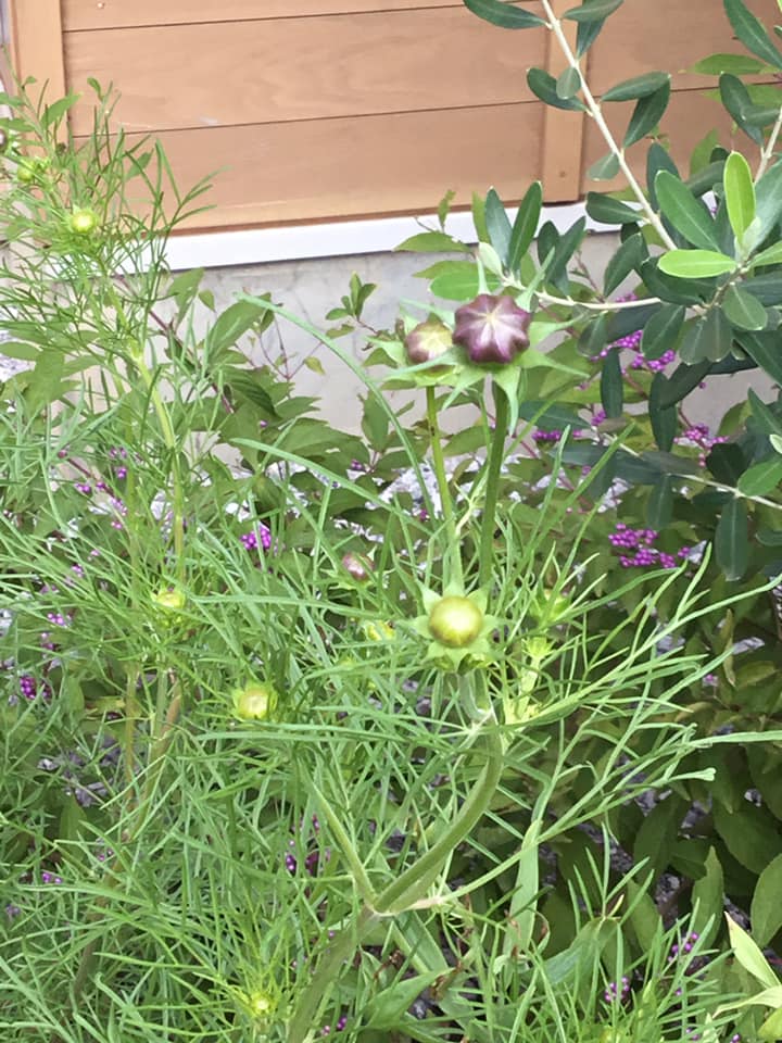 花たちもよく暑さを乗り越えてくれました。コスモスはもうすぐ咲きます。勝手に生えて来た蔓は花が咲き、実をつけ始めました。ムラサキシキブはいつ見ても色が鮮やかです。ただ庭に野鳥が来ないのは少し寂しい。もっと庭を大きくして、果樹や多くの花を植えて野鳥を呼び込みたいですね。かなわない夢か?