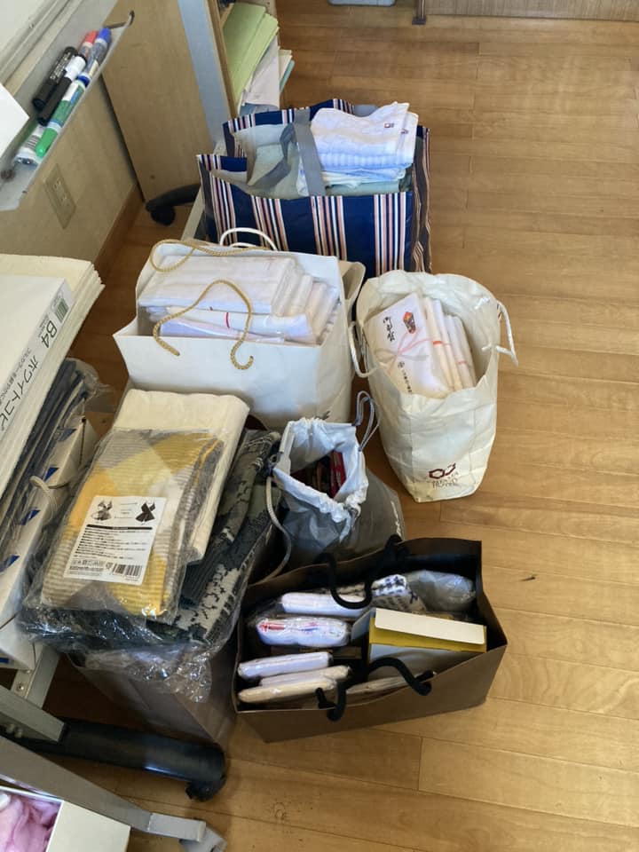 今私達のところに集まってる衣類関係です。この中から新品のみを選別して能登に届けます。
