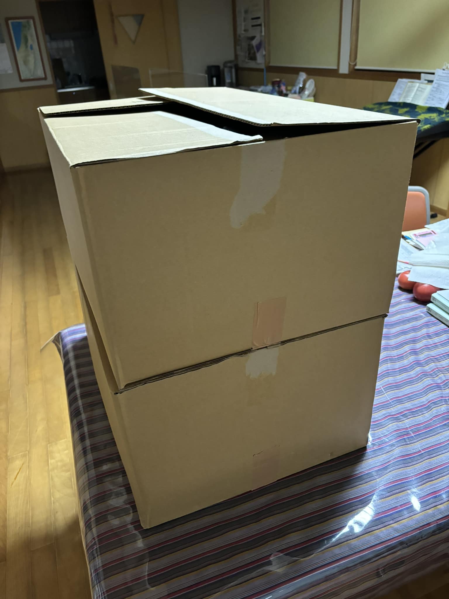 夕方帰宅後に玄関を開けたら大きな箱が置いてあった。バザー用品を届けてくれたとの事でした。