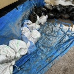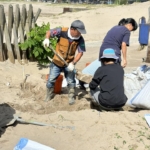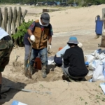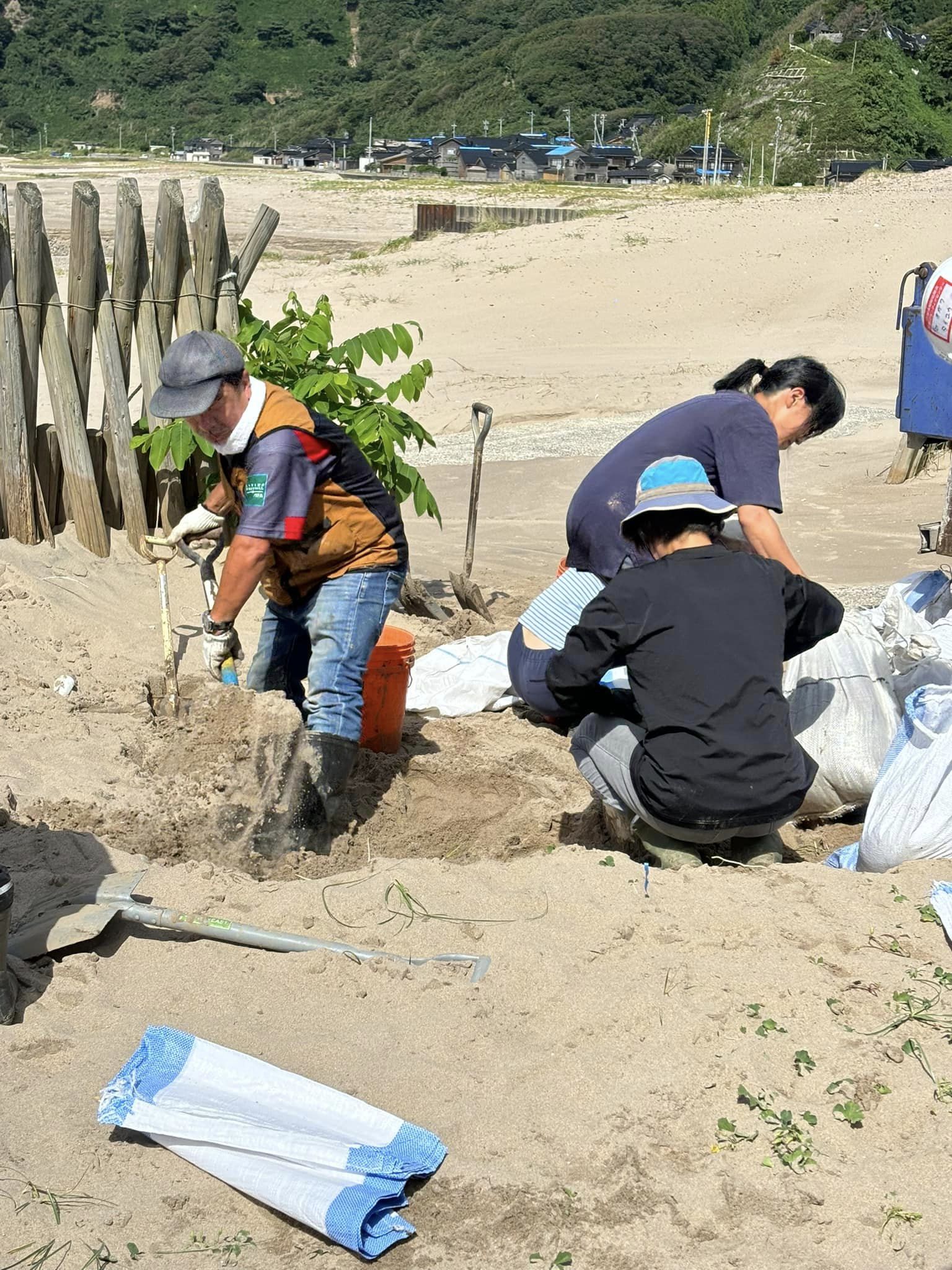 ❹許可をもらって土嚢作りしています。