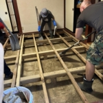 ➎今日は床上下浸水のお宅3軒の畳や家具の移動、床清掃を12名で取り組む。