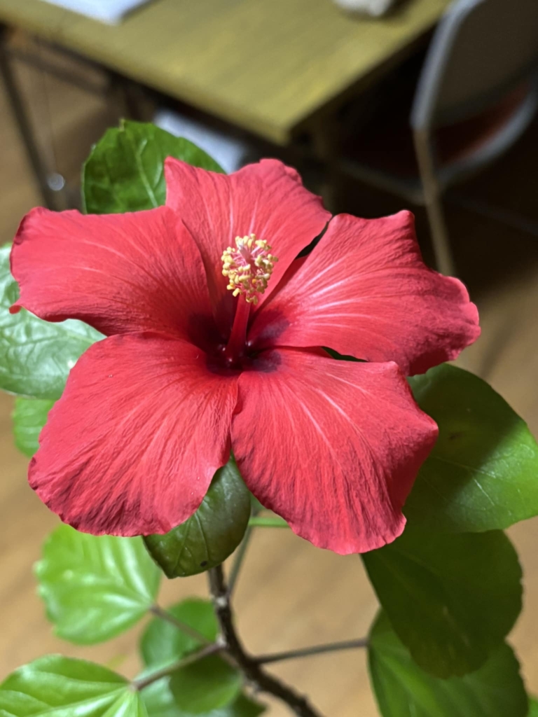 ハイビスカスが北風が冷たい中でも、温かい部屋に移したら、花を咲かせてくれました。小さな喜びです。 -