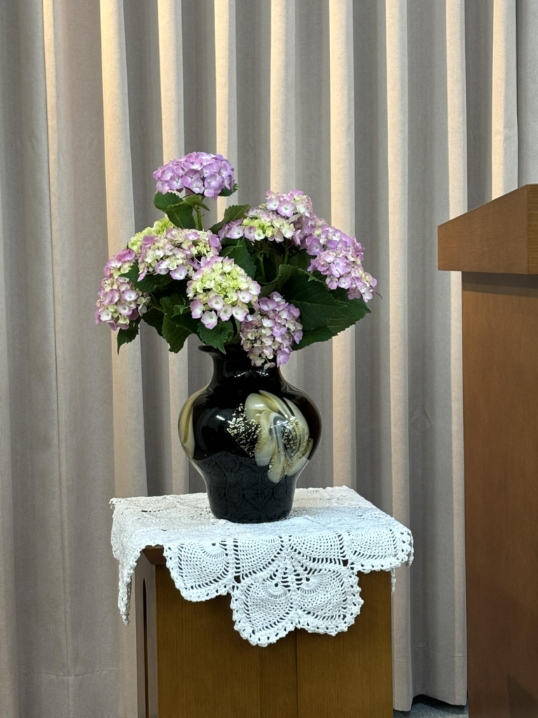 講壇の花は梅雨空に合うアジサイです。 -