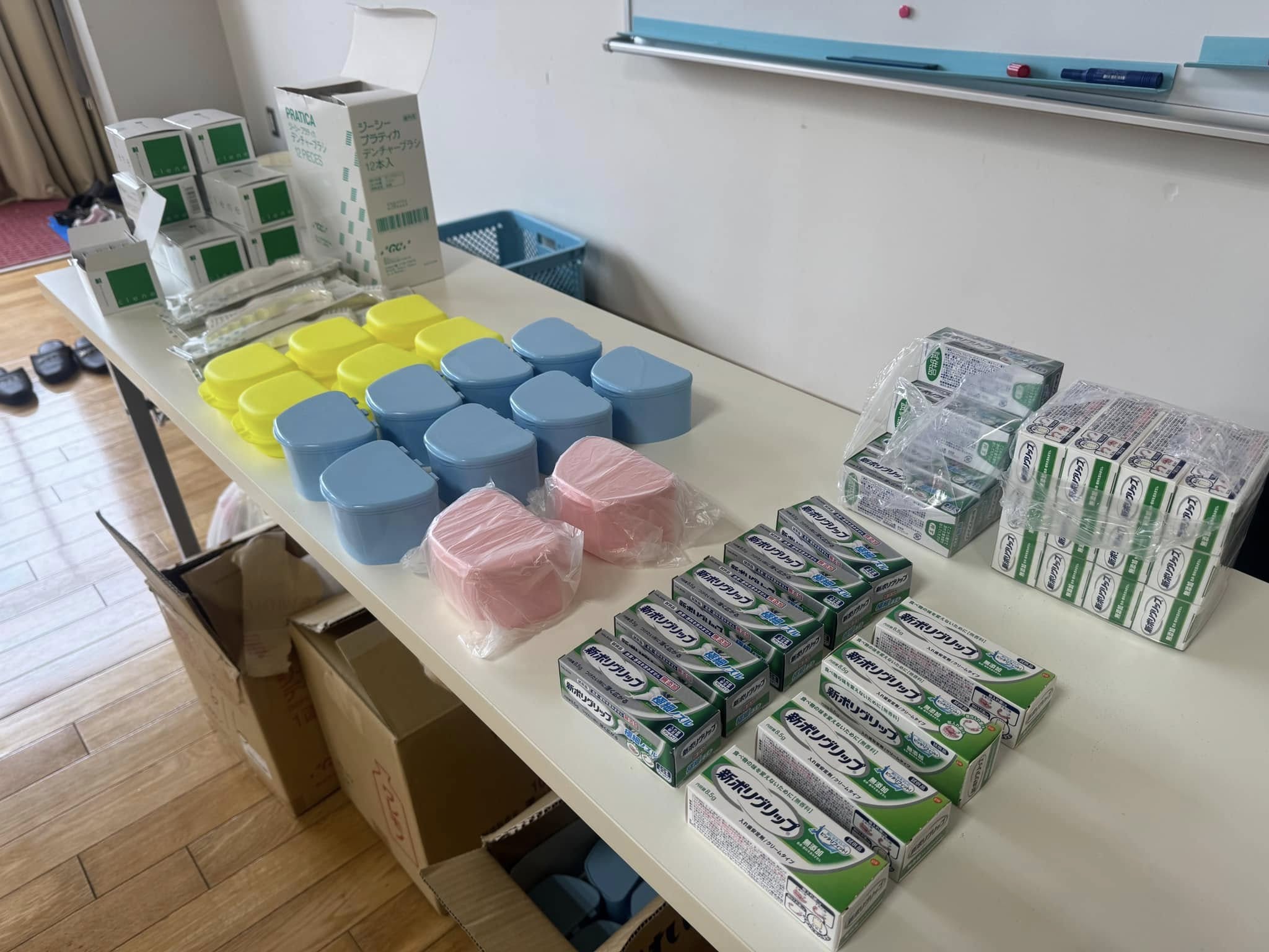 能登の皆様の為に届けた歯ブラシ、歯磨き粉、入れ歯入れ箱。マージャンも楽しんでいるようです。これが能登の皆さんの生きる力になります。