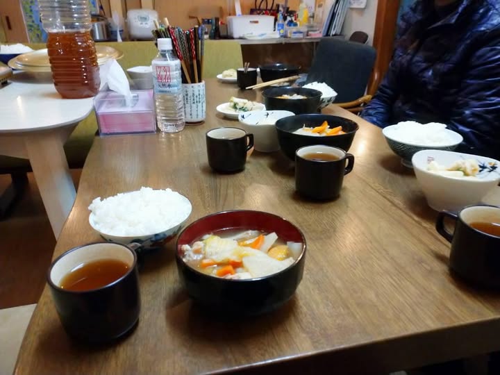 ⑥拠点に戻って楽しい夕食のひと時。ボランティア同士で語り合う。様々な情報を得て学び合う。これがとても大切な時間ですね。交流を楽しんで下さい。