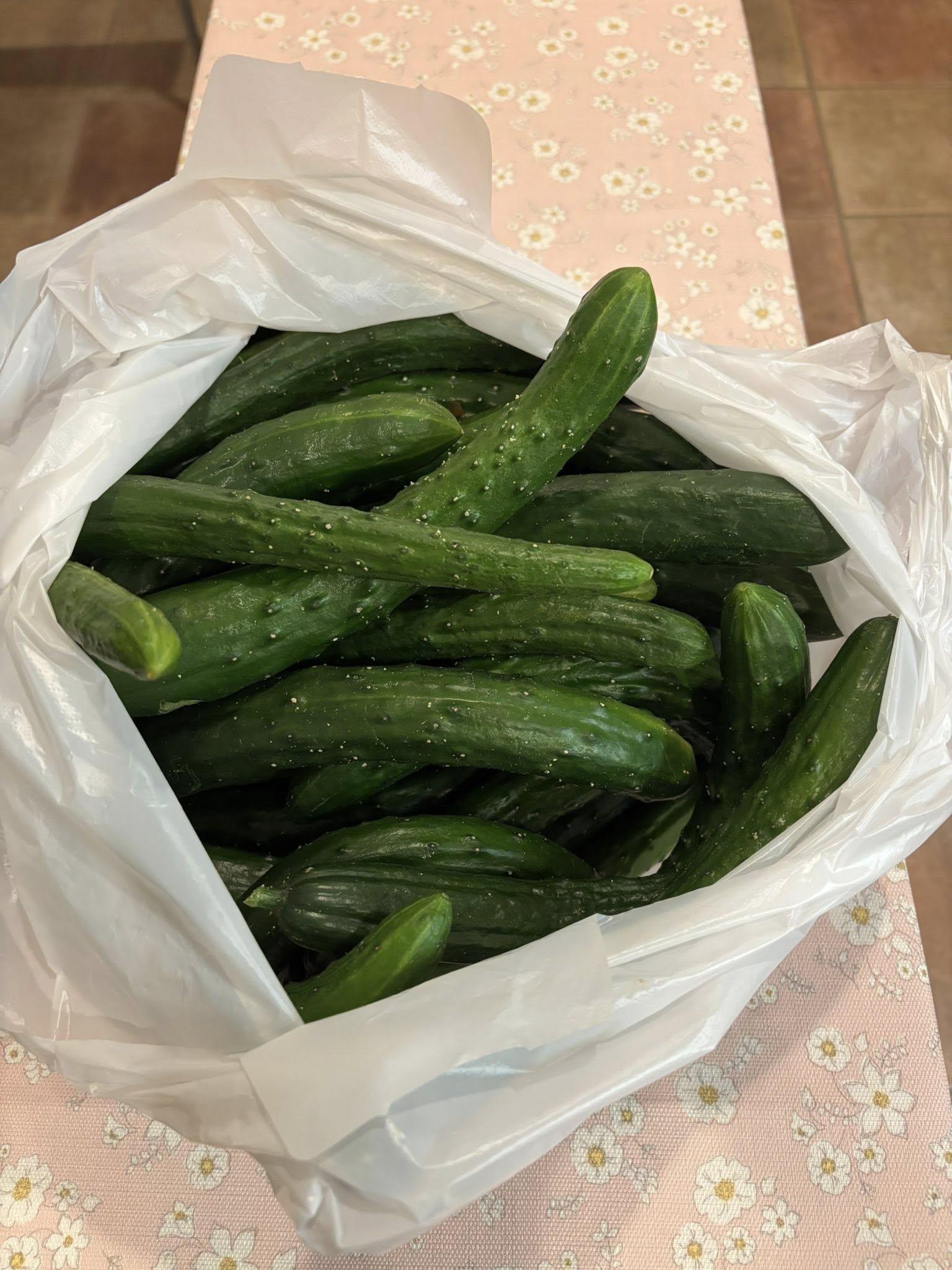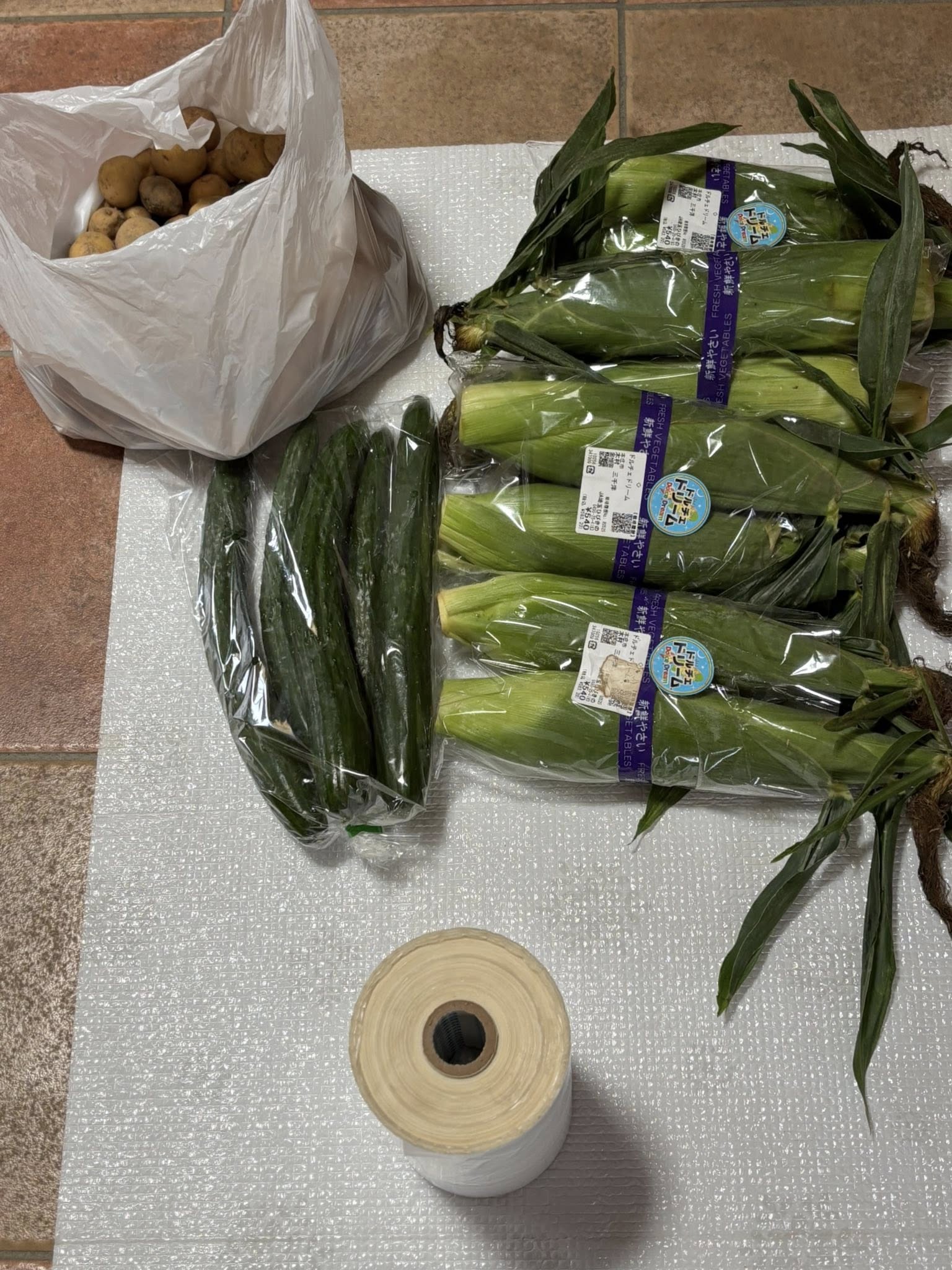 フードバンク野菜(キュウリ500本🥒とうもろこし、じゃがいも)の引き取り。特にキュウリの選別は手間が掛かる。