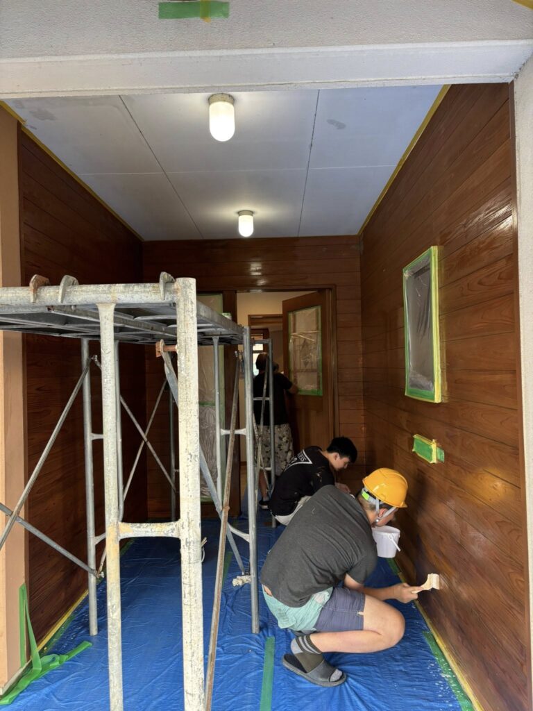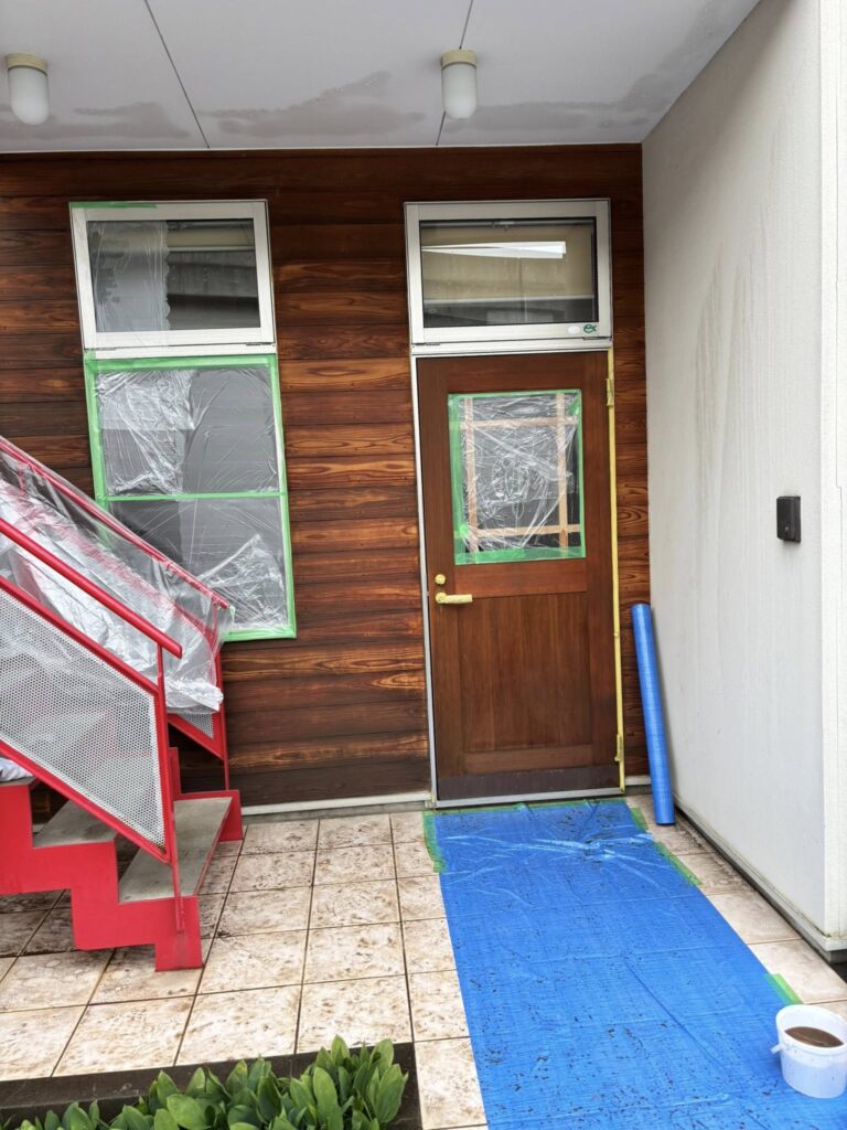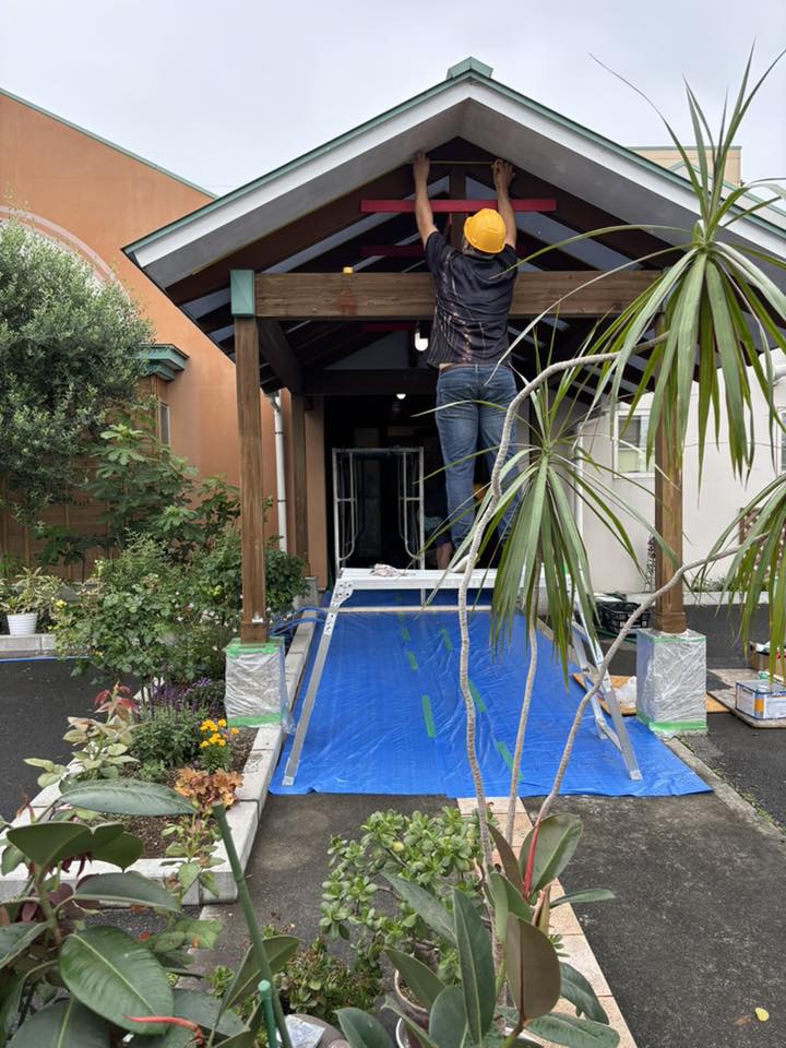 合同会社ミッション47様に会堂の木の部分を塗り替えのお願いしました。総勢10名で朝早くから仕事に取り掛かっています。さすがプロ集団です。
