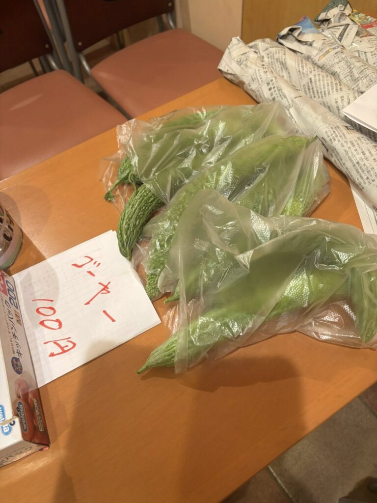 夜、白ナスとゴーヤーの寄付がありましたので包装しました。