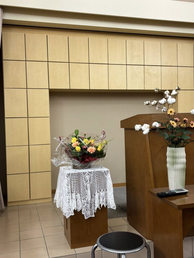 ※本庄キリスト教会は講壇後ろに「土のちり棚」が設置してあり、こちらにパウダーを安置することが出来る会堂を持っています。家族はとても喜んでいます。