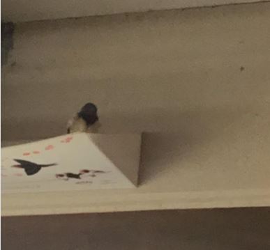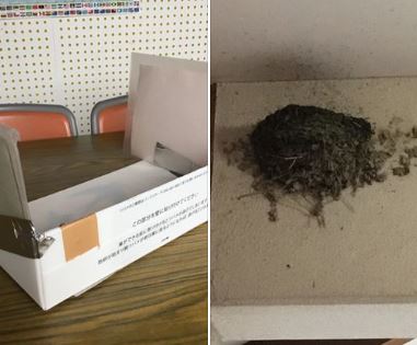 ツバメが卵を生んで温め始めたら、糞除けとカラスが下から巣を見えないようにするため、受け皿を設置する。巣作り5日目だが今日で完成するかな?
