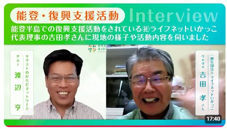 お知らせ 一社)ライフネットいかっこの能登被災地支援活動のインタビューをキリストのからだネットワークYou Tube にアップしていただきました。 17分40秒と少し長いですが是非ご覧ください。キリストのからだネットワークで検索できます。 ※関係者の皆様... -