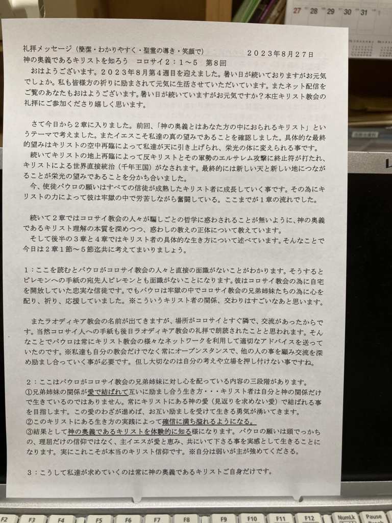 明日の礼拝説教原稿2回目の修正が終わった。 明日朝まで寝せて、最終原稿を仕上げます。 2900文字で30分以内が目標です。 さぁこれから行動開始、外回りです。