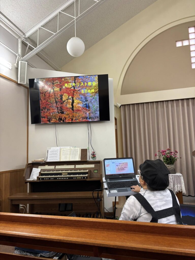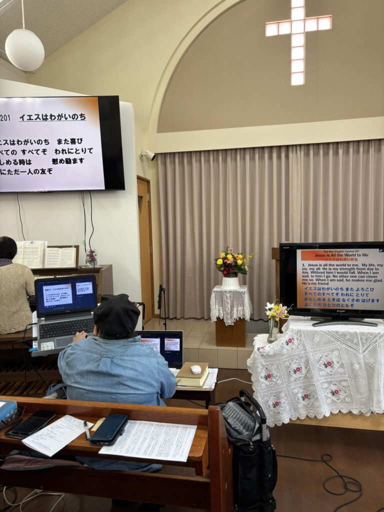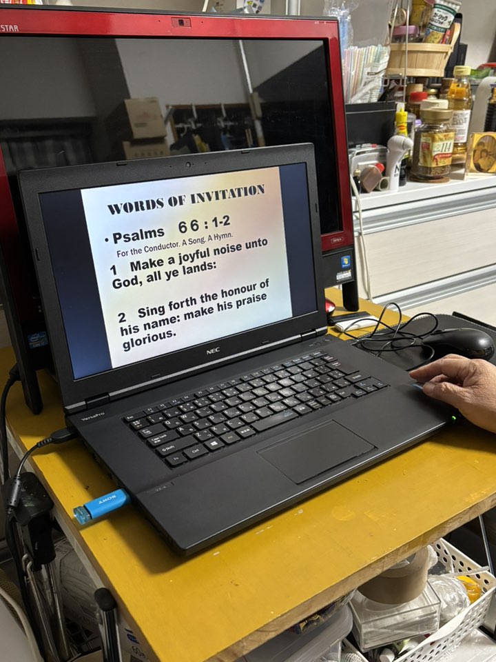 夕方、明日の礼拝準備の為にモニターの最終チェックをする為に伺った。特に英語を母語とする方の為に取り組み始めました。 -