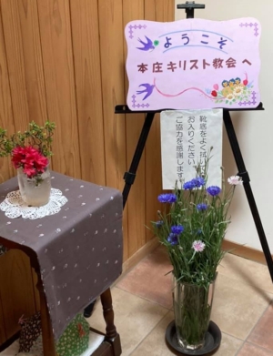 会堂清掃が済み、玄関の花も用意し、皆様をお迎えする準備が整いました。