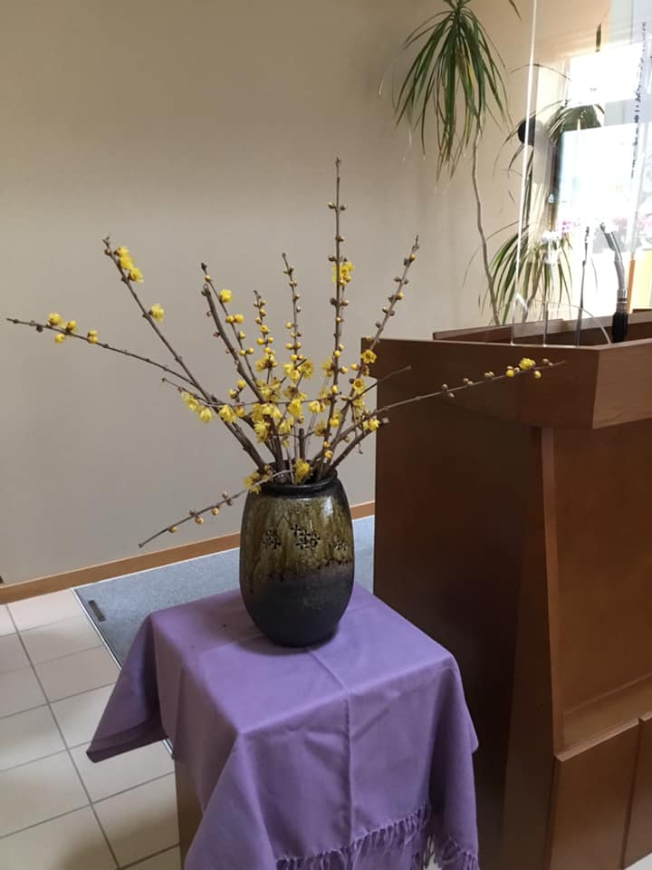 今度の日曜日の礼拝も限られた人数で、ライブ配信礼拝になりますが、 教会員の方が花を生けてくださいました。蝋梅を見ると春を感じます。 -