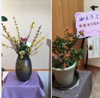 講壇のお花 ロウバイがとても良い香りです。明日の礼拝準備が整いました。 -
