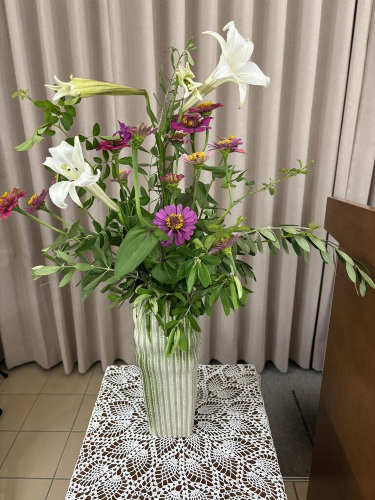 講壇の花が奉仕者によって用意され、明日の礼拝準備が整いました。感謝します。まだまだ暑い🥵日が続きます。どうぞご自愛くださいませ。牧師の宣教はIコリント12章23節〜31節「よりすぐれた賜物を熱心に求めよ」です。ご期待ください。ライブ配信も予定... -