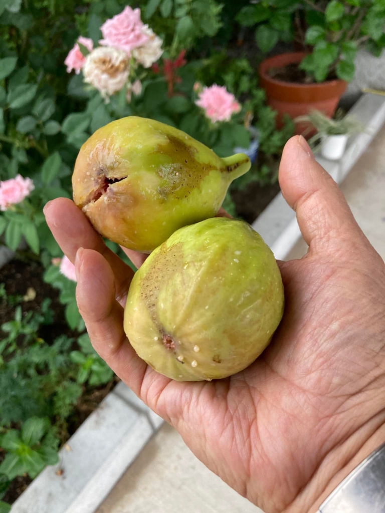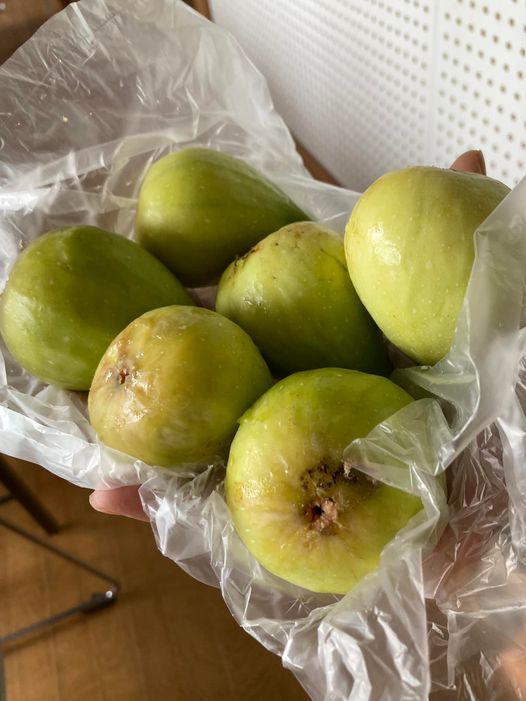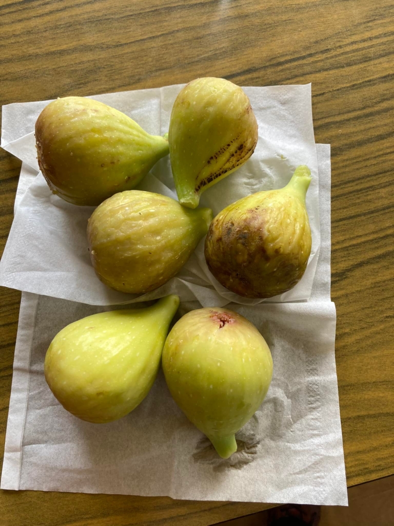 朝採りいちじくです。今日は6個 この種類は外が青いけど中身は、しっかり甘いです。最近カラスが味を覚えて食べに来ています。 -