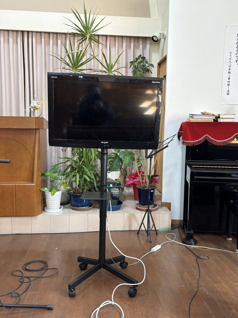 友達のディビット風間牧師が移動式テレビスタンドを設置してくれた。感謝します。これは英語を母語とする方の為に礼拝堂の前部に設置するものです。本庄キリスト教会は日本語を母語としない方が大勢いるので必要な配慮です。 -