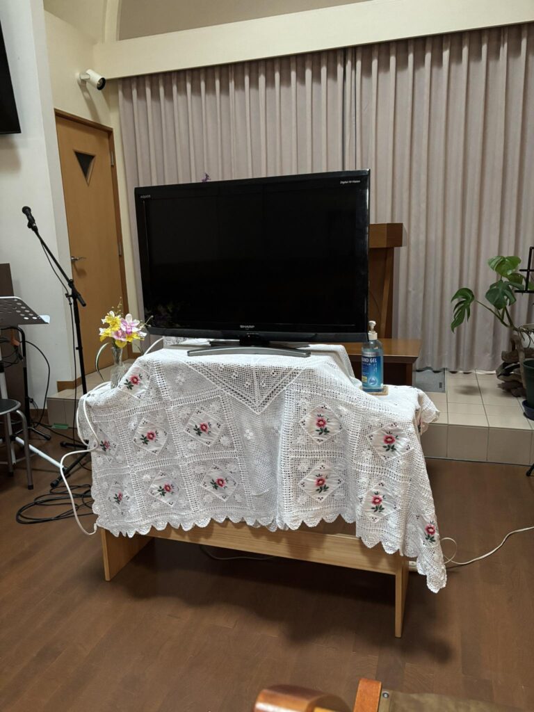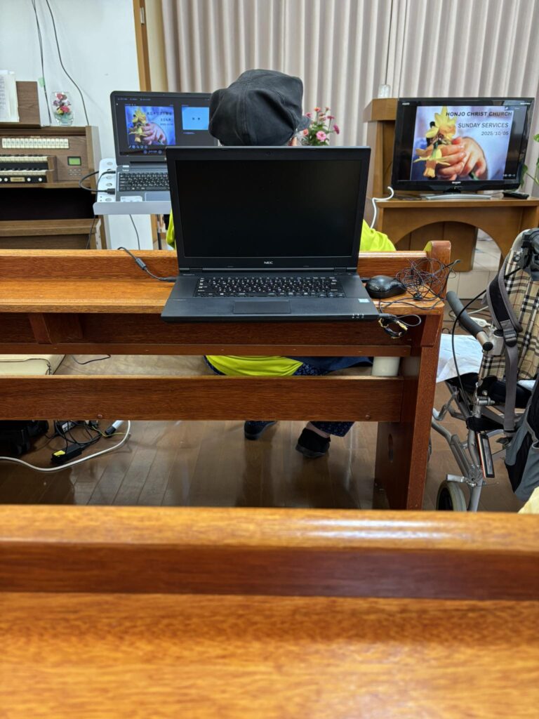 礼拝時、英語を母語とする方や馴染みのある方のためにモニターを設置しています。試行錯誤しながら皆様が利用しやすいように奮闘しています。 -