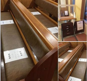 新型コロナ感染拡大に伴う対策を強化しています。 密にならないように「間を空けてください」と勧めても目印がないと人は動きません。今回、簡易シートを作り5人掛けを3人に減らしました。又、礼拝は午前と午後に開催しているので分散出席のお願いをします...