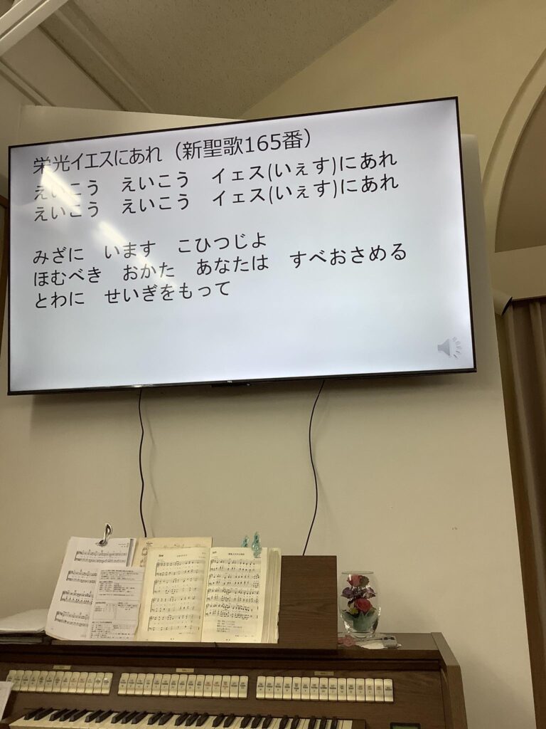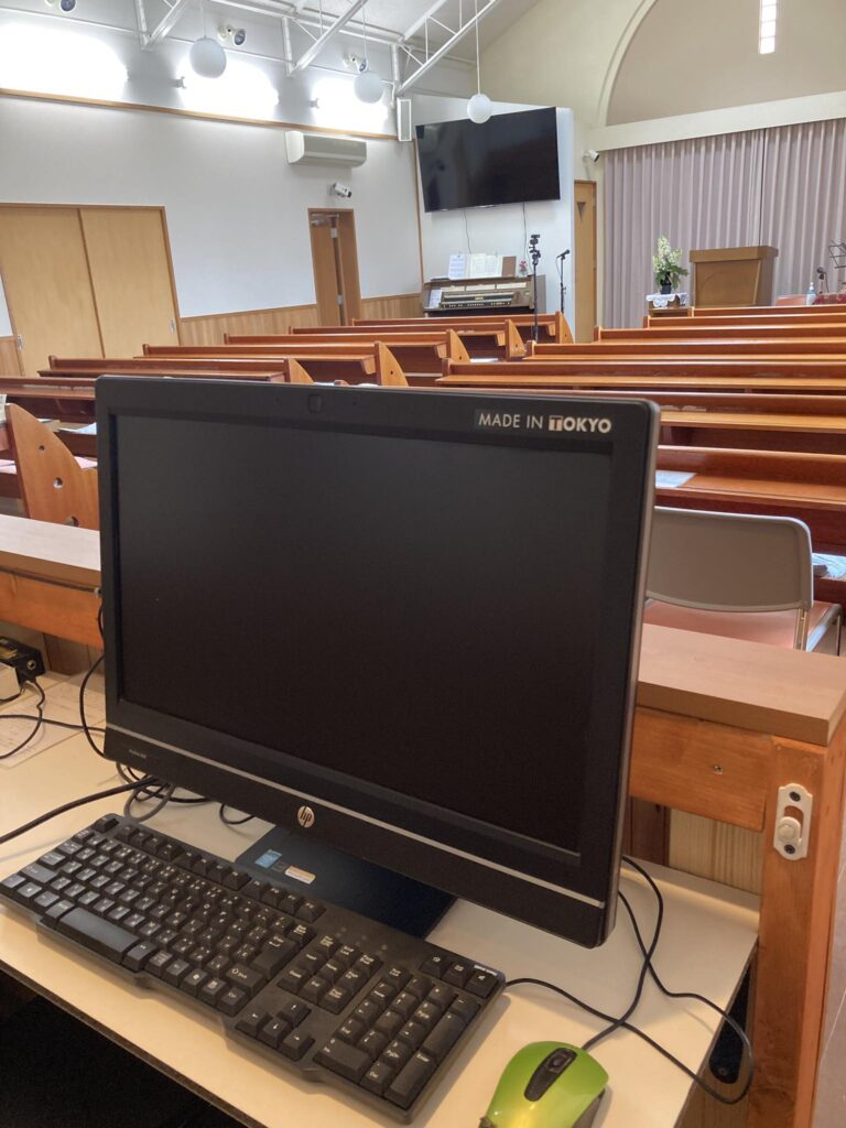 来週礼拝から正面TVに歌詞や聖句を映し出せるようになりました。外国人の方や高齢者にとって朗報です。今後スタッフが増えることを願っています。 -