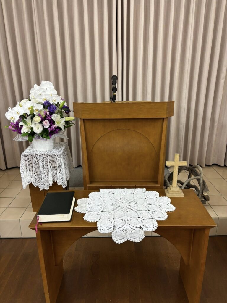 明日のK さんの記念礼拝準備が整いました。10時30分から礼拝、その後昼食会を予定しています。通常の集会はお休みします。 -