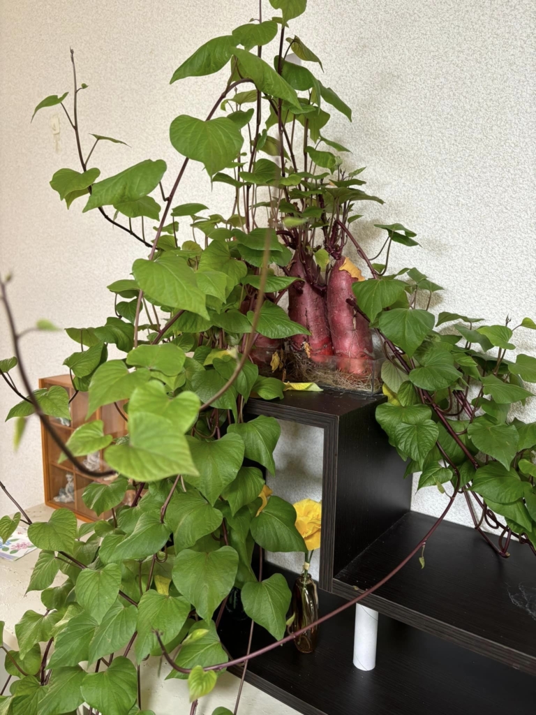 これ何だかわかりますか? 奥平さんが焼き芋にして食べようと思っていたら、芽が出てきたので水につけたらどんどん葉が成長してきたそうです。それにしても生命力が凄いですね。私もこのように逞しくなりたいです。正解は3本のサツマイモです。 -