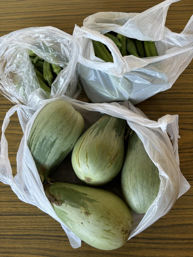 教会玄関先に野菜の贈り物が届いていた。 自分の畑で採れた新鮮オクラと高級ナス。ありがとうSさん。 -