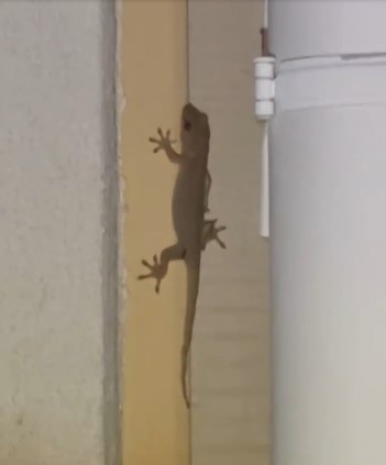 ヤモリ(家守) 夜庭の花に水やりをしていたら、外壁で会いました。前回見た個体より大きいので大人かもしれません。虫を食べ家を守ってくれてありがとう。 -