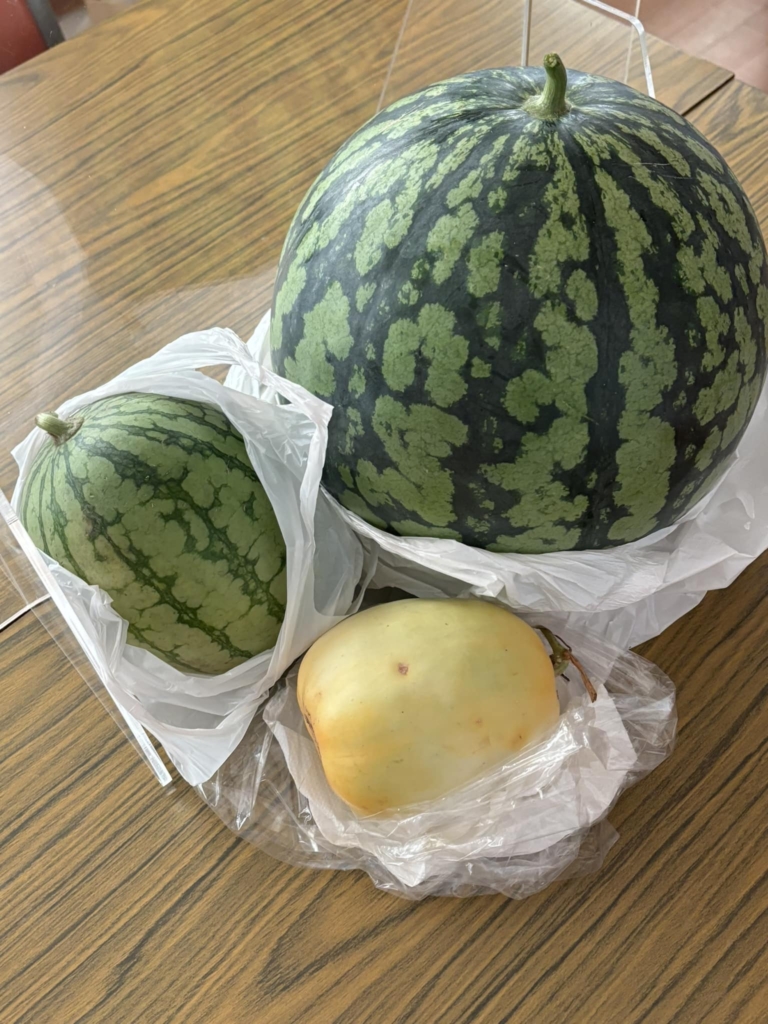 恵みのお裾分け Aさんから大玉スイカとメロン、近所のKさんから小玉スイカをいただいた。 食べきれないので皆さんと分けます。 ありがとうございます。 -
