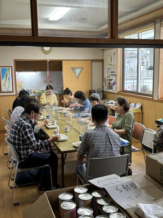 礼拝の後、自然発生的に集まり、食事するようになりました。皆さん楽しそうです。 食事を希望する方は担当者に声をかけてください。200円です。 -