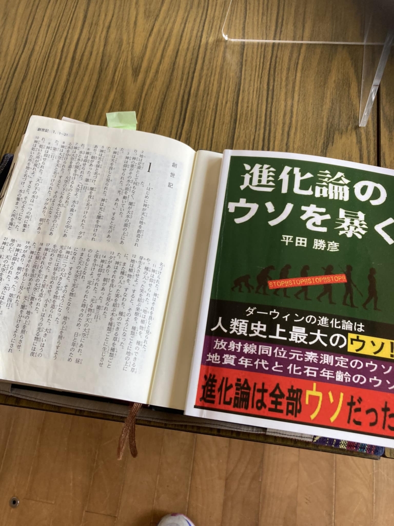木曜日の聖書を読む会は聖書と、「進化論の嘘をウソを暴く本」を読み比べ聖書の視点(創世記)から学んでいます。 私は聖書の一言一句を神の言葉と信じる創造論の立場に立つキリスト者なので非常に興味深く学んでおります。 -