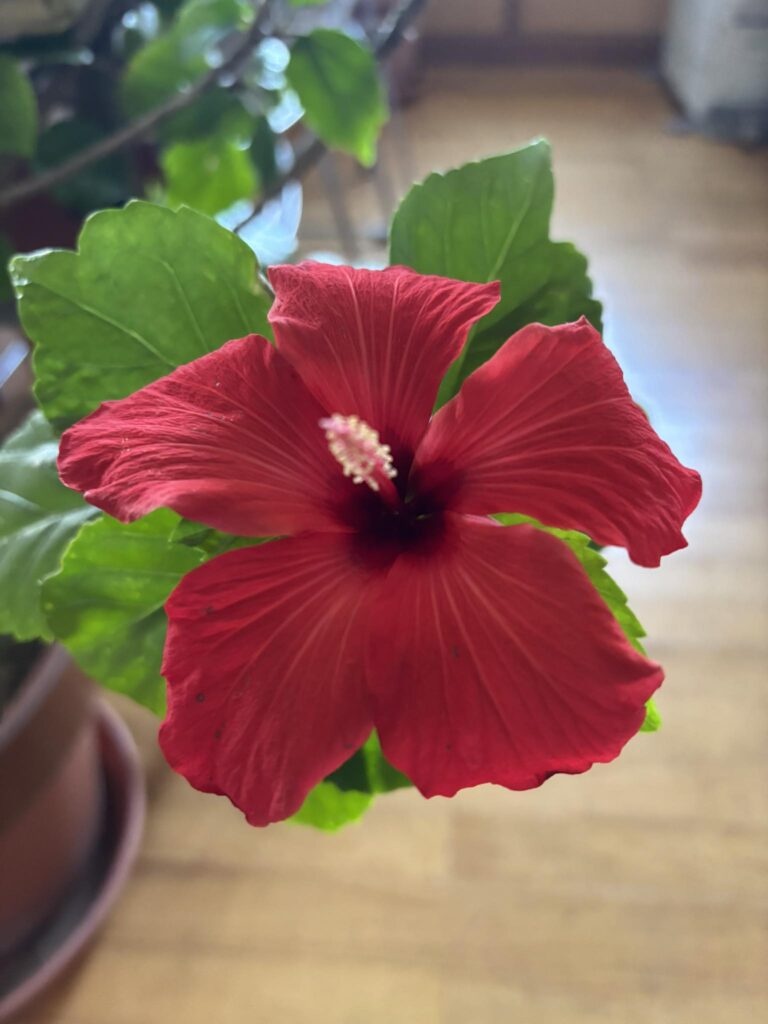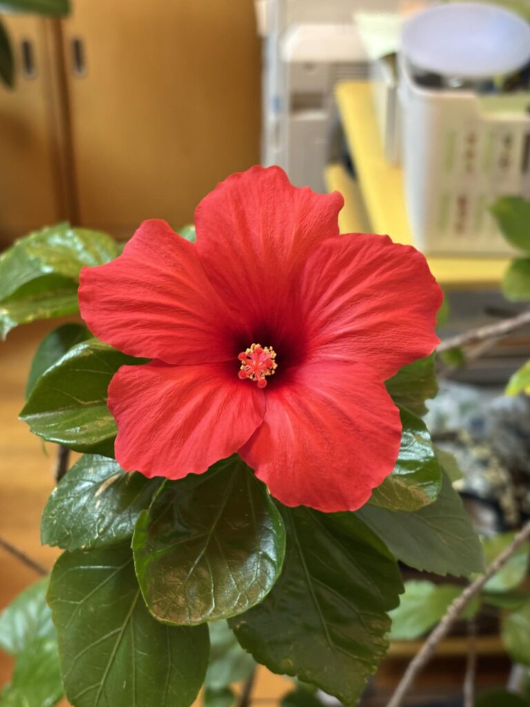 室内に移動したハイビスカスが新年早々に咲いてくれました。花は正直ですね。環境さえ整えれば咲いてくれます。暖かくなったら剪定します。 -
