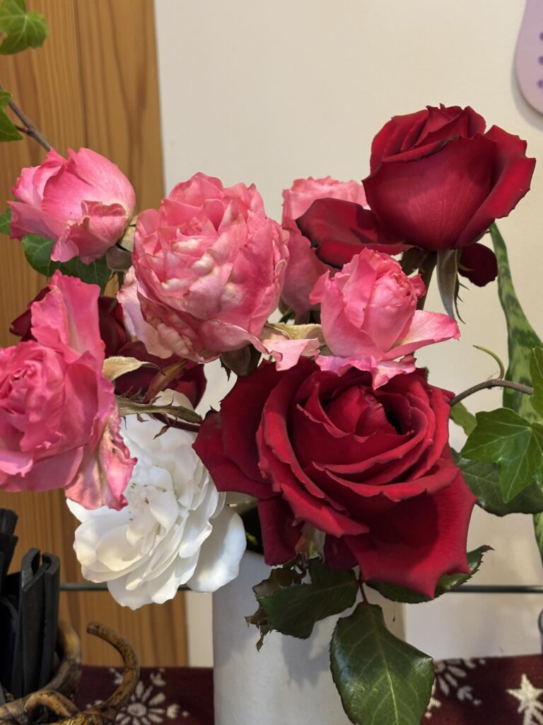明日のクリスマス礼拝に備え玄関の歓迎花を新しく飾りました。まだ庭のバラが使えます。感謝🥲 -