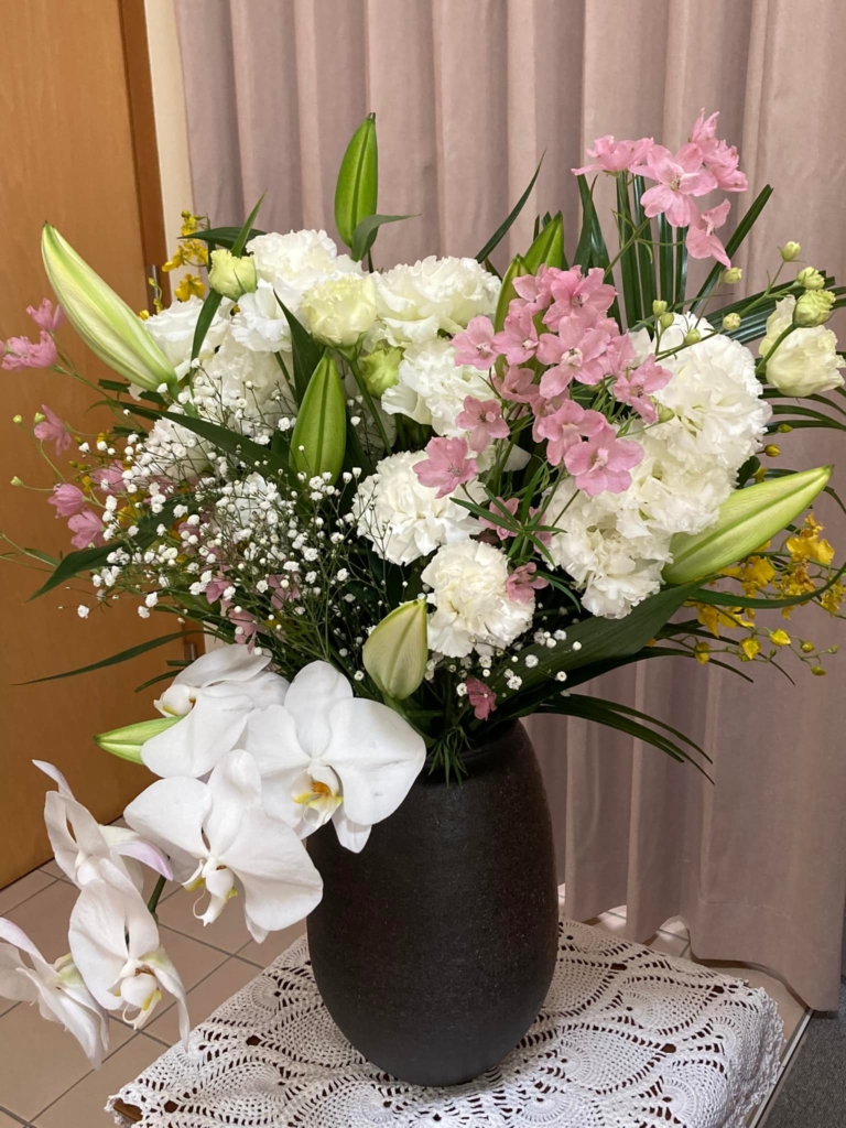 明日の礼拝に備え講壇の花に一工夫する。 ピンクを加えると一味違います。