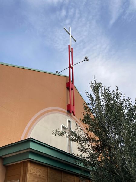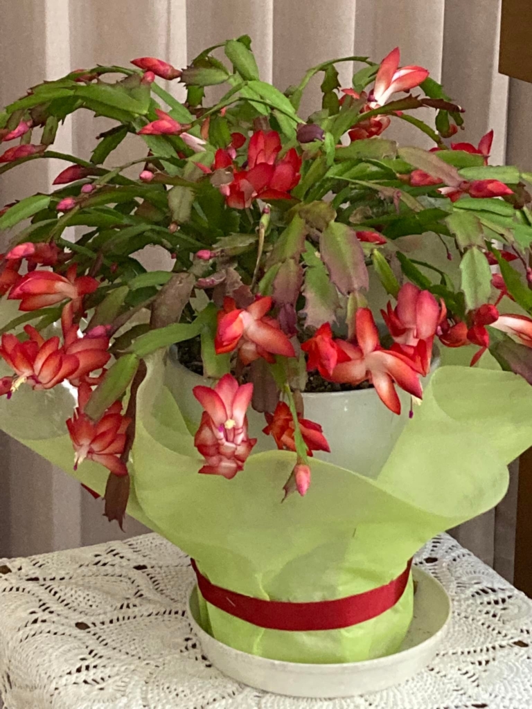 講壇の花を シャコバサボテンにしました。 鉢にカバーをつけると少し華やかになります。 -