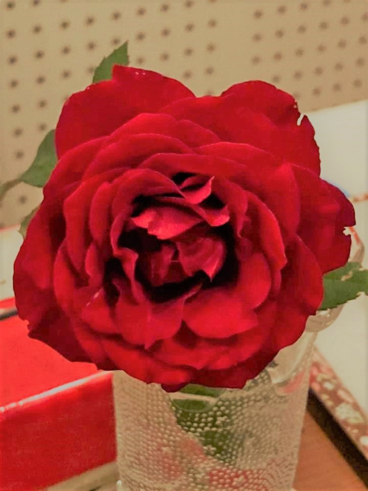 バラが見えにくいところに咲いていたので切り取って玄関に飾ってみました。来客を歓迎します。 -