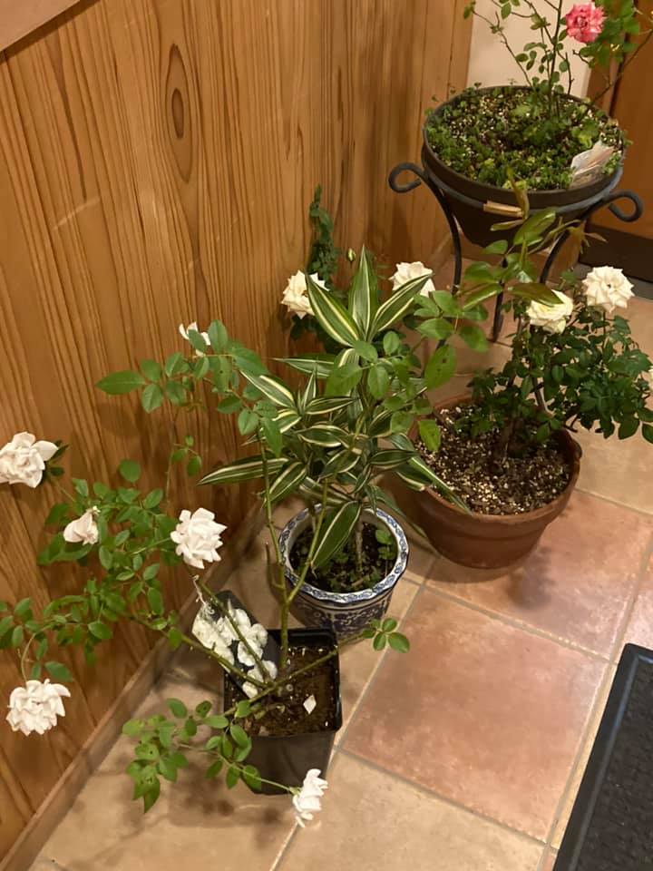 台風に備えて 植木鉢は玄関に避難、赤いバラは花を切り取り室内へ。今晩から明日は外出を最小限にする予定です。 -