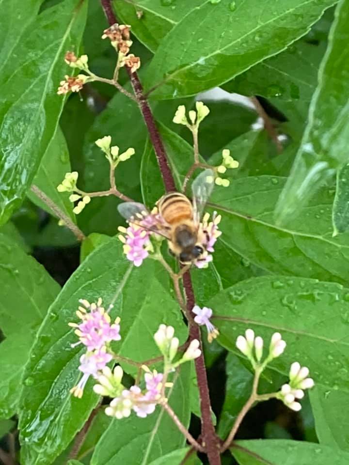 朝起きて庭を見ると色々な発見があります。今朝はムラサキシキブの花にミツバチがせっせと、受粉作業。こういう、ゆとりが良いですね。今日もお元気で! -