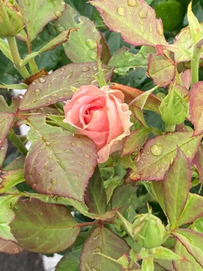 薔薇の花がしっとり咲いています。 小さな存在でも、自分らしく花を咲かせ実を結ぶ、そんな人生がおくれたら良いですね。 -
