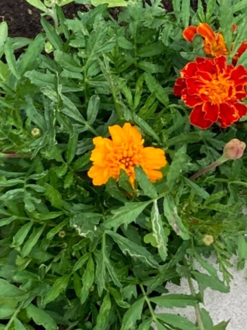 おはようございます。 庭のマリーゴールドは2種類ある様です。お隣さんから風で飛ばされた種から毎年沢山の花が咲いています。得した気分!今日も良いお仕事を! -