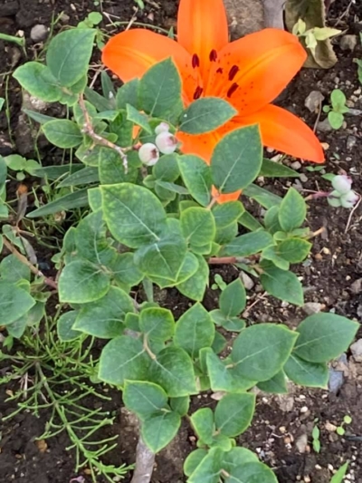 おはようございます。 妻が植え替えたブルーベリー🫐 今年は実をつけたなぁ。毎年ヒヨドリが食べるので私たちは食べられません。残念! 百合の花が目立ちすぎ!今日も良いお仕事を! -