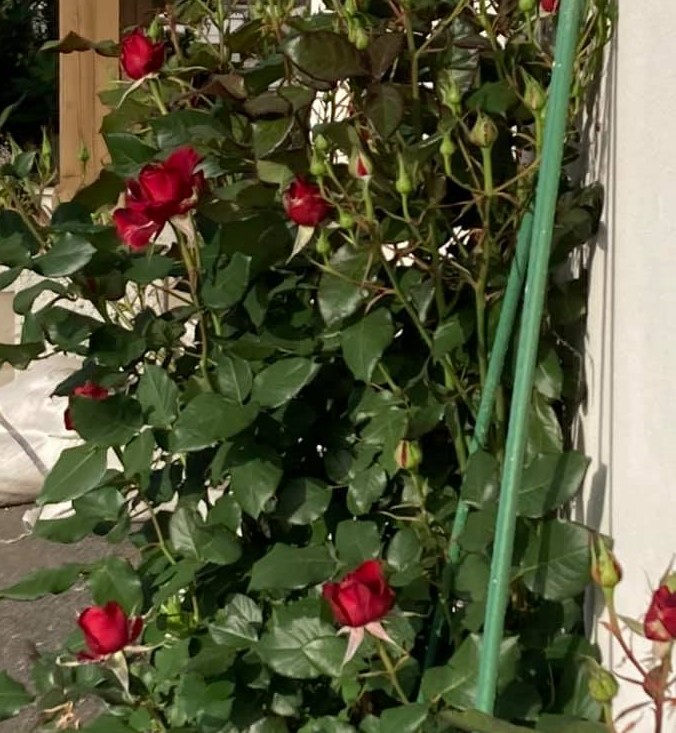 青空の下、バラの開花が進みました。① こちらのバラも開花が進んでいます。② -