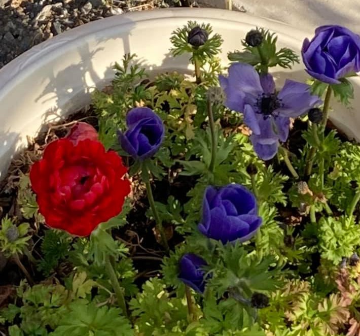教会 庭紹介 アネモネが二色咲き出す。創造のみわざは綺麗な色を出してくれます。