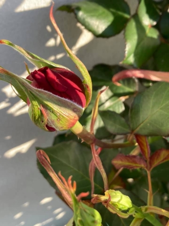 教会庭紹介 バラが大きな蕾をつけています。5月が楽しみだ! -